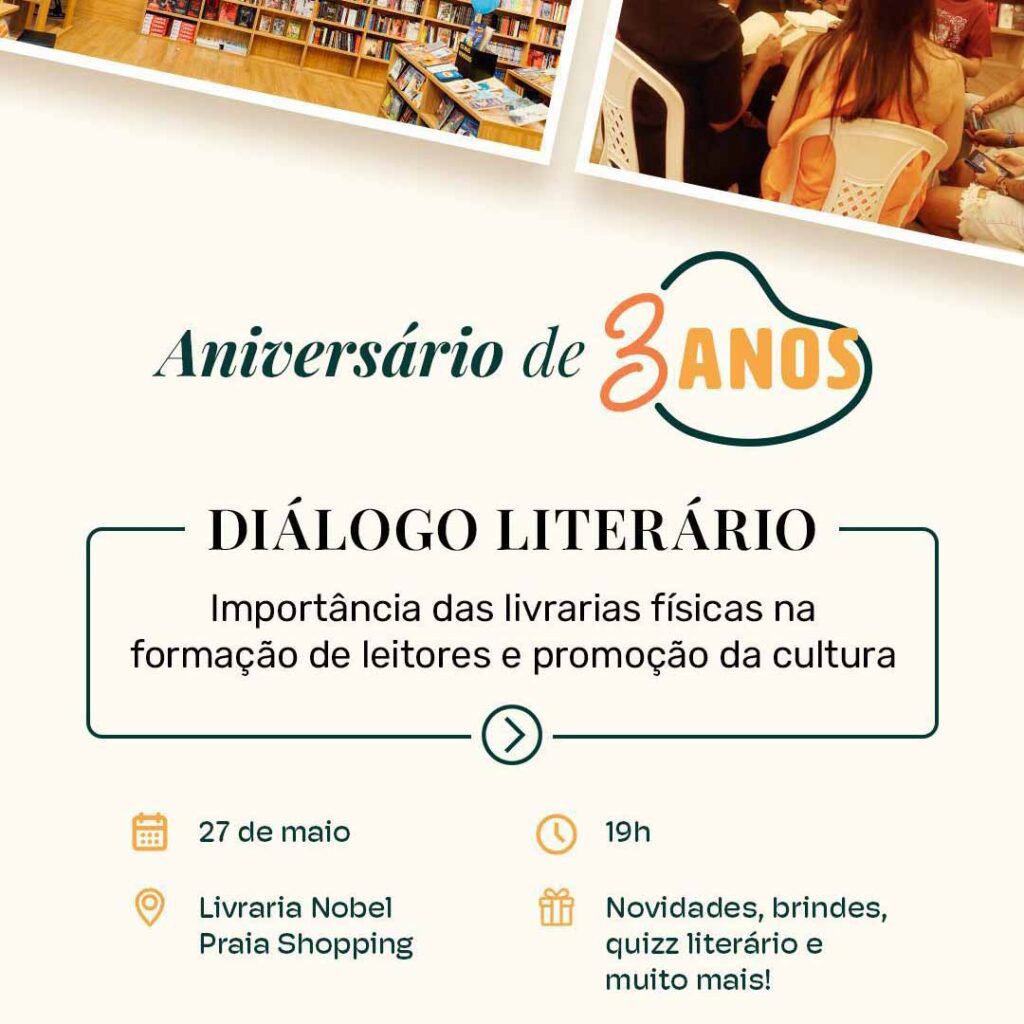 Nesta terça-feira (27), a partir das 18h30, a livraria Nobel, o Kave Casa Café e a loja Zastras celebram seus três anos de atuação no Praia Shopping, em Natal. Para marcar a data, os empreendimentos promovem uma noite especial, aberta ao público, com experiências que unem cultura, gastronomia e lazer. A programação inclui diálogo literário com convidados especiais, experiência sensorial com cafés especiais do Kave, além de um quiz literário com brindes, menu comemorativo e o anúncio de novidades para os clientes. “O evento é uma oportunidade de celebrarmos a trajetória construída nesses três anos, fortalecendo nosso compromisso com a cultura, a literatura, os encontros e a experiência de quem nos acompanha desde o início”, destaca a gestão da unidade. A Nobel Praia Shopping se consolidou como um espaço de convivência, onde a livraria, o café e a loja de brinquedos educativos Zastras se complementam, oferecendo aos clientes muito mais do que produtos: uma verdadeira experiência cultural e sensorial. Serviço:Aniversário de 3 anos – Nobel, Kave Casa Café e Zastras Praia ShoppingData: 27 de maio (terça-feira)Horário: A partir das 18h30Local: Praia Shopping – Av. Engenheiro Roberto Freire, 3132 – Capim Macio, Natal/RNEntrada gratuita