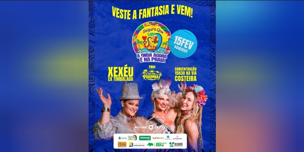 A folia segue com tudo em Natal! O bloco Segura Que Deu Onda realiza mais uma edição neste domingo (15), na Via Costeira, prometendo arrastar uma multidão de foliões com muita animação, fantasias e energia lá em cima. A concentração acontece a partir das 15h30, no trio do Bloquinho Vai Dar Prainha, nas proximidades do Vila do Mar. O percurso é aberto ao público e segue até a Prainha, transformando a orla em um verdadeiro corredor da alegria. No palco, a grande atração é Xexéu, ex-integrante da Timbalada, além das apresentações da banda Submarino Amarelo e do projeto Sax In The House. Os últimos ingressos estão disponíveis no site oficial do evento. A expectativa é de mais uma tarde de sucesso na programação carnavalesca da capital potiguar.