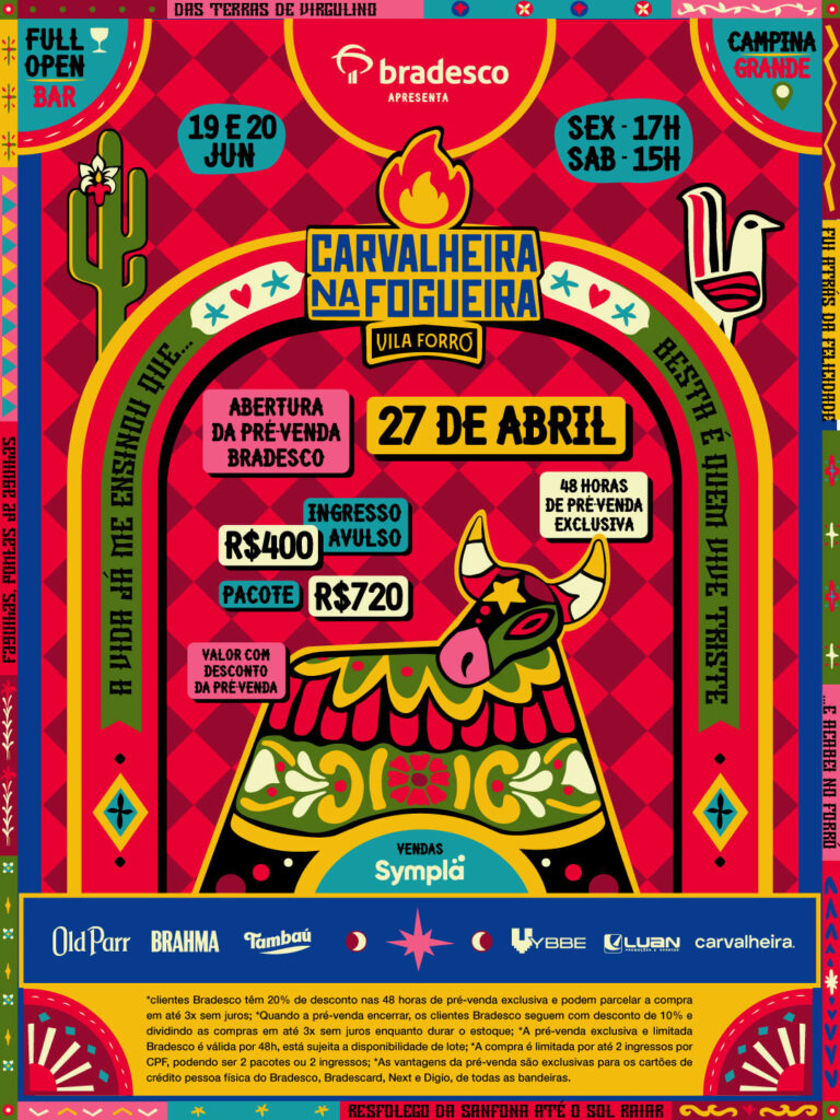 No primeiro ano em que o Carvalheira na Fogueira se une a Vila Forró, atrações de peso vão fazer a alegria do tradicional evento junino. Estreando em Campina Grande, o CNF escalou um time de gigantes para compor o line up dos dois dias de festa – 19 e 20 de junho. Entre os confirmados estão Nattan, Xand Avião, Menos é Mais, Matheus e Kauan, Zé Vaqueiro, Henry Freitas, Léo Foguete e mais. Para quem quer garantir presença, o Bradesco preparou condições especiais para a pré-venda, que se inicia no dia 27 de abril. Serão 48h com 20% de desconto, iniciando ao meio-dia, para os clientes Cartões Bradesco (next, Bradescard e Digio). Além disso, também será possível parcelar a compra em até 3x sem juros. Após o encerramento da pré-venda (no dia 29 de abril), os clientes Bradesco seguem com direito a 10% de desconto e parcelamento de até 3x sem juros, enquanto durar o estoque. A compra é limitada a 2 ingressos por CPF, podendo ser 2 pacotes ou 2 ingressos avulsos. O Carvalheira na Fogueira Vila Forró celebra a união entre três grandes produtoras: Vybbe, Luan Promoções e Carvalheira, que prometem trazer uma nova estrutura, além de um verdadeiro mix entre forró, sertanejo, eletrônica e muito mais. > Atrações confirmadas: SEXTA Palco Vila Zé Vaqueiro . Menos é Mais . Henry Freitas . Felipe Amorim . Samyra Show Vila Dreams Cat Dealers . Liu . Rooftime . JØRD SÁBADO : Palco Vila Nattan . Xand Avião . Matheus e Kauan . Léo Foguete . Lipe Lucena Vila Dreams D-Nox . Ashibah . Bruno Be . Chemical Surf . Riascode