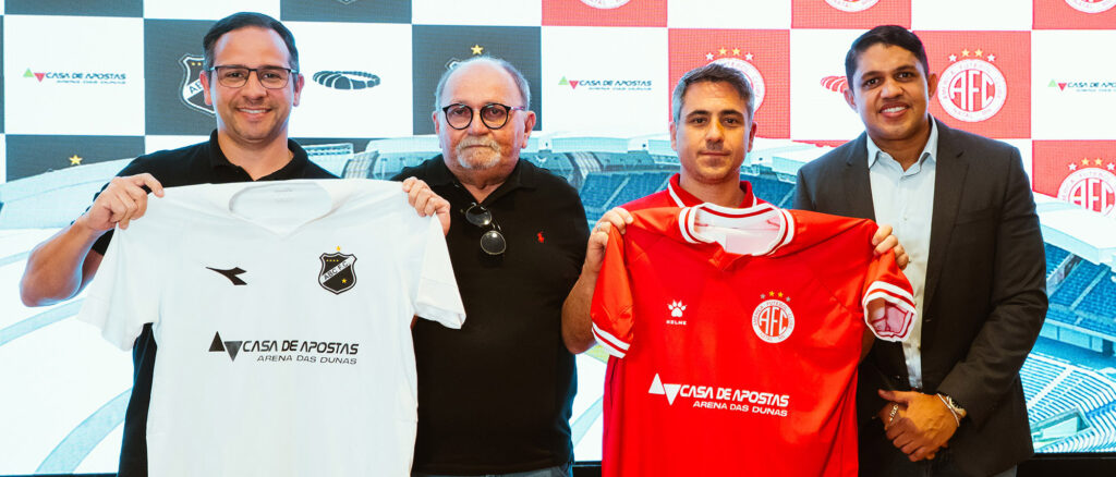 A Casa de Apostas Arena das Dunas anunciou na tarde da última quinta-feira (31) o patrocínio para os dois maiores clubes do Rio Grande do Norte: ABC e América, que já está em vigor e tem duração até o final do ano, englobando a reta final dos campeonatos nacionais. A parceria foi anunciada pelo diretor-presidente da Arena das Dunas, Ricardo Ferreira, ao lado do CEO da SAF do América, Vitor Arteiro, do presidente do ABC, Luiz Eduardo Machado Pereira, e do presidente da Federação Norte-rio-grandense de Futebol (FNF) e vice-presidente da Confederação Brasileira de Futebol (CBF), José Vanildo. O patrocínio inclui investimento nos clubes e prevê a exposição da marca na parte frontal das camisas de jogos das equipes. Com o patrocínio no futebol, a Arena Natal reforça seu compromisso de apoio ao esporte potiguar. “Acreditamos na força transformadora que o esporte pode exercer na vida das pessoas. Nosso objetivo com a parceria é contribuir para fomentar o futebol no Rio Grande do Norte, além de incentivar a geração de investimentos na modalidade. Investir no esporte é investir no futuro”, afirma o diretor-presidente da Casa de Apostas Arena das Dunas, Ricardo Ferreira. Com a nova parceria com América e ABC, a Casa de Apostas Arena das Dunas alcança mais um nicho de apoio ao esporte potiguar. A Arena patrocina, desde 2024, o time de futebol feminino Sociedade Esportiva União, que participou em 2025 da Série A3 do Campeonato Brasileiro e do Campeonato Potiguar.