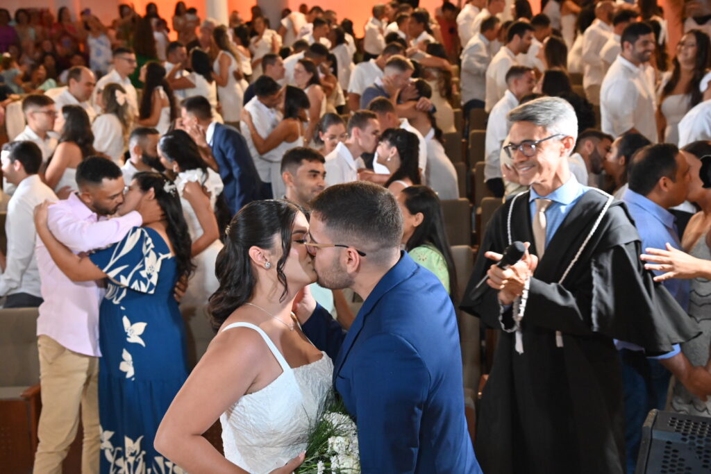 O palco do Teatro Municipal Ubirajara Galvão, em Currais Novos, ganhou uma nova função nesta terça-feira (23): virou altar para 49 casais que oficializaram sua união em uma emocionante cerimônia de casamento coletivo. A ação integrou a programação do Assembleia e Você, projeto da Assembleia Legislativa do Rio Grande do Norte em parceria com o Tribunal de Justiça do RN. A celebração foi conduzida pelo juiz Marcus Vinícius, titular da 1ª Vara da comarca, que oficializou os casamentos diante de familiares, amigos, autoridades locais e representantes da ALRN. Emoção, histórias de superação e muito amor marcaram a noite especial. “Esperei 26 anos por esse momento. Hoje, eu não estou apenas me casando, estou reafirmando um amor que resistiu ao tempo e às dificuldades”, relatou, com lágrimas nos olhos, a noiva Ângela Maria. Já o noivo Gilmar Machado destacou o significado da oportunidade: “A gente achava que nunca ia conseguir pagar por um casamento. Mas hoje, com esse projeto, realizamos um sonho com dignidade e respeito”. Presente na cerimônia, a vice-prefeita de Currais Novos, Milena Galvão, também celebrou o momento: “É uma honra ver nossa gente sendo valorizada com um gesto tão significativo. Esse evento enche nossos corações de alegria e reforça o papel da política quando ela se volta para o bem comum”. O Assembleia e Você segue em Currais Novos até o dia 25 de abril, oferecendo serviços gratuitos à população nas áreas de cidadania, saúde, educação e lazer. A cidade vive dias de celebração não apenas de casamentos, mas de encontros, inclusão e pertencimento.