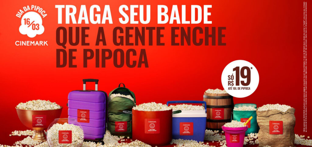 O Dia da Pipoca, celebrado em 11 de março, pode não ser um feriado, mas, neste ano, a Cinemark decidiu comemorar a data em grande estilo com uma ação nacional inédita dedicada ao seu snack premiado e irresistível! No dia 16 de março, a rede realiza a promoção ‘Traga seu Balde’, que permite que o público leve um recipiente de sua preferência – aquele balde colecionável icônico de um filme específico, ou o balde favorito de pipoca que está na família há gerações ou até um recipiente super original e inédito no melhor estilo “faça você mesmo” – em um cinema da rede para encher com até 10 litros de pipoca por apenas R$ 19,00. A promoção será a primeira ação do gênero feita pela rede no Brasil. Nos Estados Unidos, uma ação similar foi uma febre entre o público, com centenas de pessoas levando as mais diversas embalagens para serem abastecidas com o snack. Aqui no Brasil, qualquer balde está liberado, mas é necessário seguir uma regra: o recipiente precisa estar higienizado, ser impermeável (caso o cliente queira a manteiga na pipoca) e adequado ao consumo de alimentos. Baldes, potes, bacias… a criatividade não tem limites! Pelo valor de R$ 19,00, o público garante até 10 litros de pipoca, equivalente a 2 baldes de pipoca da Cinemark. É importante se atentar: não será oferecido refil, ou seja, a promoção não garante o reabastecimento fracionado dos baldes, e sim apenas de forma única. Se o cliente levar um “balde“ menor que 10 litros, o mesmo será preenchido até a sua capacidade. Cinemas com snack bar prime não participam (Iguatemi São Paulo, Cidade Jardim, Lar Center, Iguatemi Campinas Prime e Village Mall). Consulte a unidade mais próxima ou o site da Rede para mais informações. “O Dia da Pipoca vem se tornando um dos marcos do ano na Cinemark e para os amantes do snack. A celebração merece uma ação especial para destacar ainda mais a nossa pipoca premiada – eleita pelos próprios clientes como a melhor do mercado. O cheirinho da pipoca é a porta de entrada do cinema e a experiência sem o snack não fica completa. No dia 16 de março, convidamos a todos para soltarem a imaginação com seus recipientes e aproveitarem junto com a gente um dos snacks mais tradicionais e amados das salas de cinema por um preço incrível”, destaca Vinícius Porto, Diretor de Marketing da Cinemark Para convidar o público a se engajar na ação, a Cinemark conta com uma campanha criada em parceria com a Magenta. Entre os esforços de comunicação, a agência elaborou um filme – assista aqui, com veiculação nos cinemas da rede e nas redes sociais, e que convida as pessoas a se esbaldar de pipoca na Cinemark. Além da live especial com o Jovem Nerd, que aconteceu durante a transmissão ao vivo do Oscar 2025, a campanha conta com uma ação de Fake Out Of Home que trará imagens de grandes baldes de pipocas em diversos pontos conhecidos de São Paulo – assista aqui. Uma ativação especial ainda levará uma piscina de pipoca ao cinema do Shopping Eldorado, na capital paulista. A agência Atômica Lab será a responsável pelas ações com influenciadores. *O “balde” precisa estar higienizado, ser impermeável e adequado ao consumo de alimentos. Promoção “Traga seu Balde”: Dia da Pipoca na CinemarkQuando: A compra e retirada acontecem apenas no dia 16/03/2025 (domingo).Canais de venda: Em todos os canais da rede: App, Site, ATM e bilheteriaOnde: Em todas as unidades padrão da Cinemark no país. Não participam cinemas Prime: Iguatemi São Paulo, Cidade Jardim, Lar Center, Iguatemi Campinas Prime e Village Mall.Valor: R$ 19 (até o limite de 10 litros de volume de pipoca salgada – doce não participa). Consulte o site da Rede para mais informações.