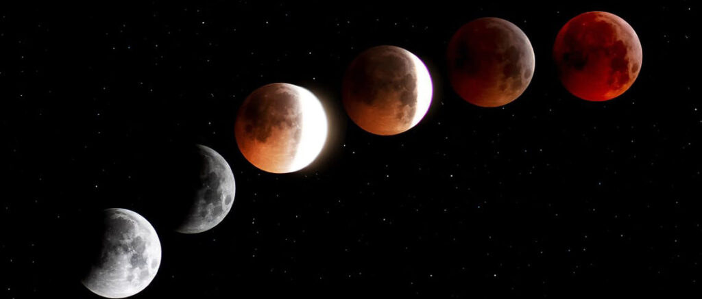 O eclipse acontece quando Sol, Terra e Lua ficam perfeitamente alinhados. O processo começa com a Lua entrando na penumbra, provocando apenas uma leve redução de brilho — mudança quase imperceptível a olho nu. Em seguida, ocorre a entrada na umbra, quando a sombra da Terra passa a “recortar” o disco lunar.
